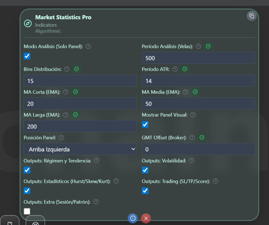 Beneficio para vosotros: Podéis usar Market Statistics Pro tanto para análisis rápido (leyendo el Trading Summary y el Market Score) como para estrategias automatizadas (conectando solo los outputs que necesitéis, por ejemplo Score ≥ 6 + régimen tendencia + Hurst > 0,55). El panel deja de ser un «datos por datos» y pasa a ser una herramienta de decisión.