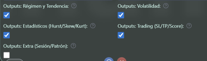 Nuevos outputs conectables: Skewness (sesgo direccional), Kurtosis (riesgo de colas), Market Score, Mejor Sesión (0=Asia, 1=London, 2=NY) y Señal de Patrón (1=alcista, -1=bajista, 0=neutral), todos opcionales y controlados por los grupos de outputs.