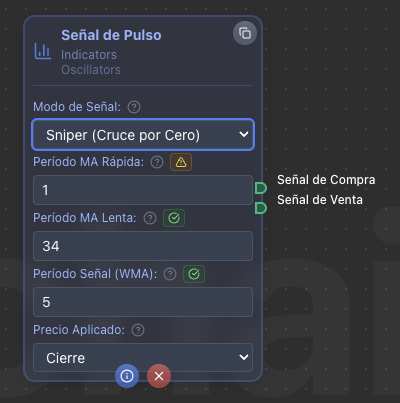 - Pulse Signal (por defecto): cruce del oscilador con una línea de señal WMA; el modo más filtrado y con menos señales falsas.