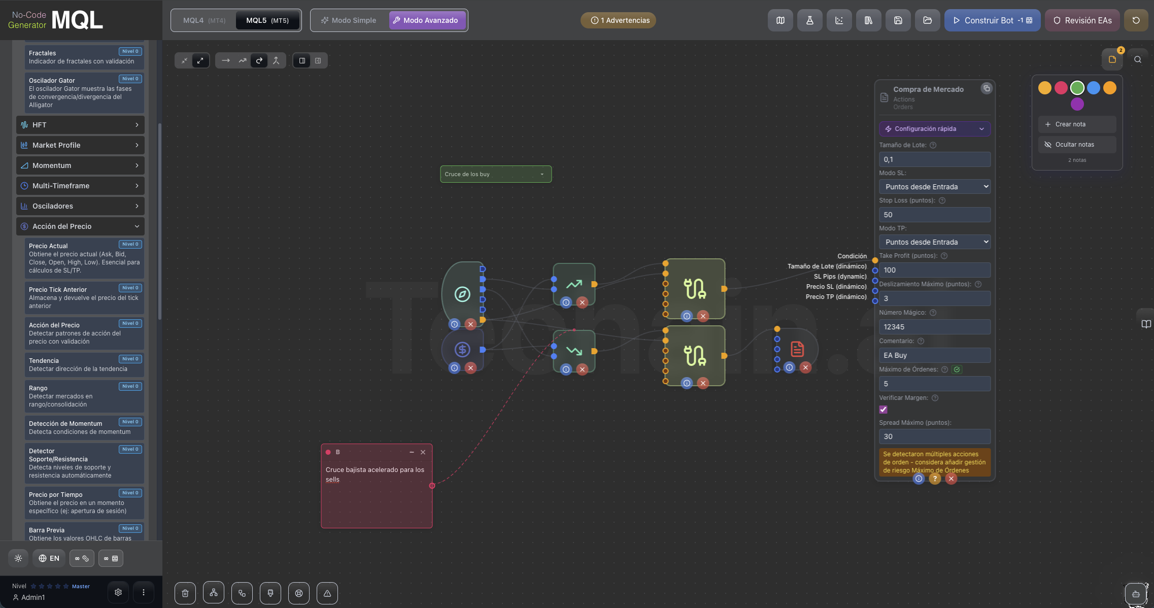 Qué resuelven: Resuelven la necesidad de documentar y organizar estrategias complejas sin ensuciar el código ni añadir nodos falsos. Las notas no intervienen en la generación del EA: el generador las ignora por completo, así que podéis usarlas con total libertad. Además, se guardan con el proyecto (proyectos personales, biblioteca, etc.) y podéis eliminar una conexión nota–nodo haciendo clic sobre la línea punteada.