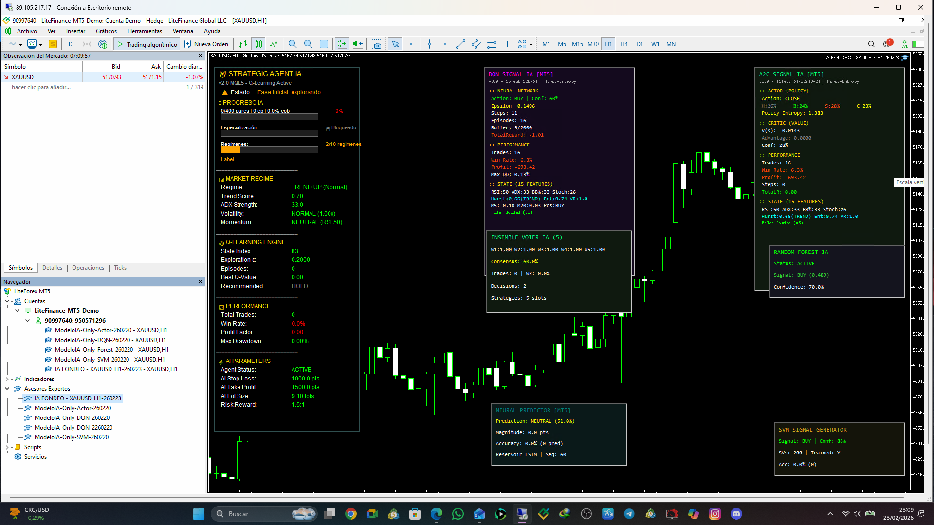 - Cinco “cerebros” (DQN, Actor-Crítico, Random Forest, Predictor neuronal, SVM) que piensan distinto → si varios coinciden, la señal es más fiable; si uno falla, los otros pueden compensar.