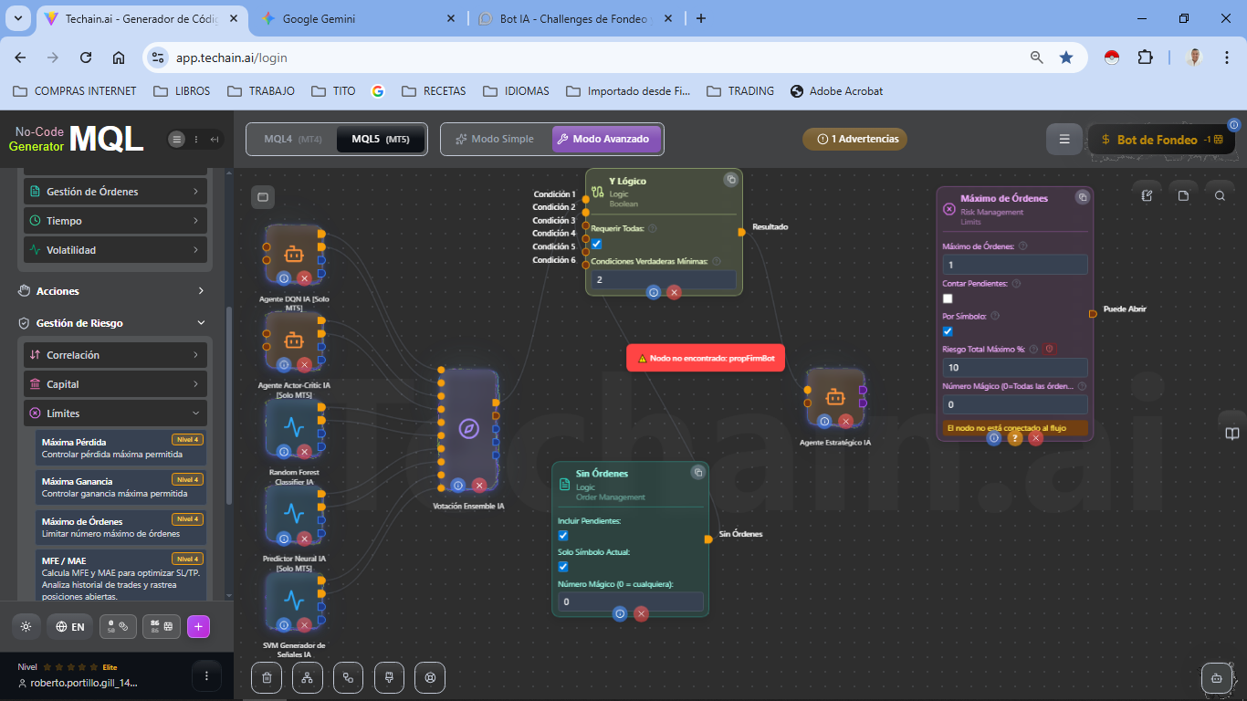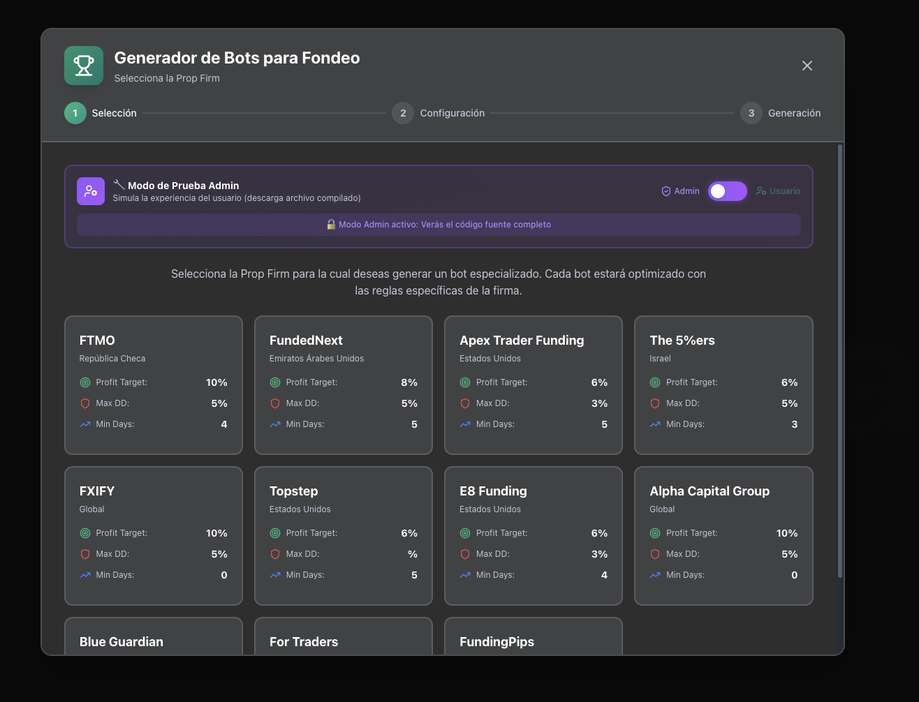 El creador de bots para challenge de fondeo es donde se generan los bots específicos ya para un broker de fondeo, se accede desde esta función (es el que tienes tu):