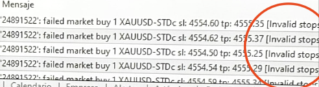 Invalid Stops = esto significa que las distancias de los stops que le tienes puestas son muy pequeñas (cercanas a la entrada) y no se pueden colocar, por eso no te llega a abrir la orden, ya que esta se envía junto con los stops y se deniega la ejecución total.
