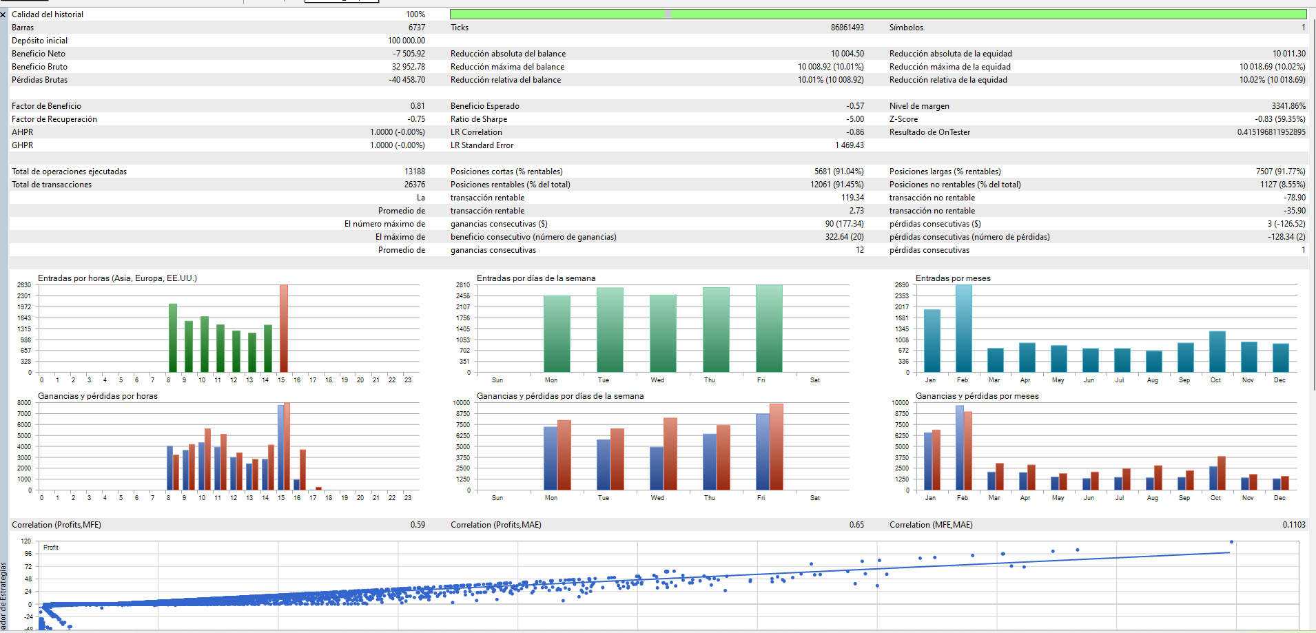 Me alegro que hayas terminado el backtesting, veo que tienes calidad del modelado 100%, eso es importante, para que lo que pasa sea real. No se si tuviste en cuenta los spread variables y las comisiones del broker, para descontarlas, imagino que si.