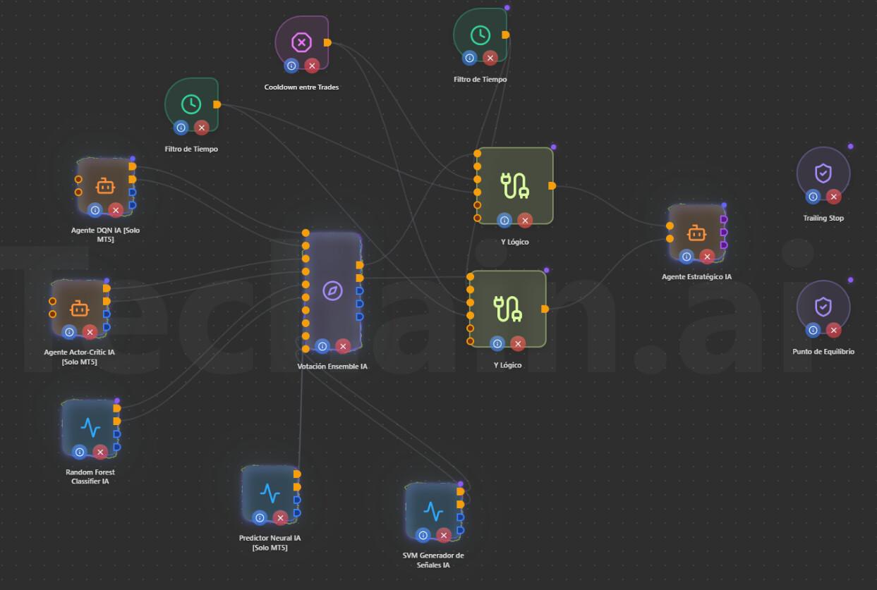 El nodo de Agente Estratégico IA gestiona la operativa, es decir, las señales que recibe. Decide si hacerlas o no, y como gestionarlas en caso de que las haga, todo conforme a la configuración que el usuario le haya especificado (el no inventa, sigue las normas).