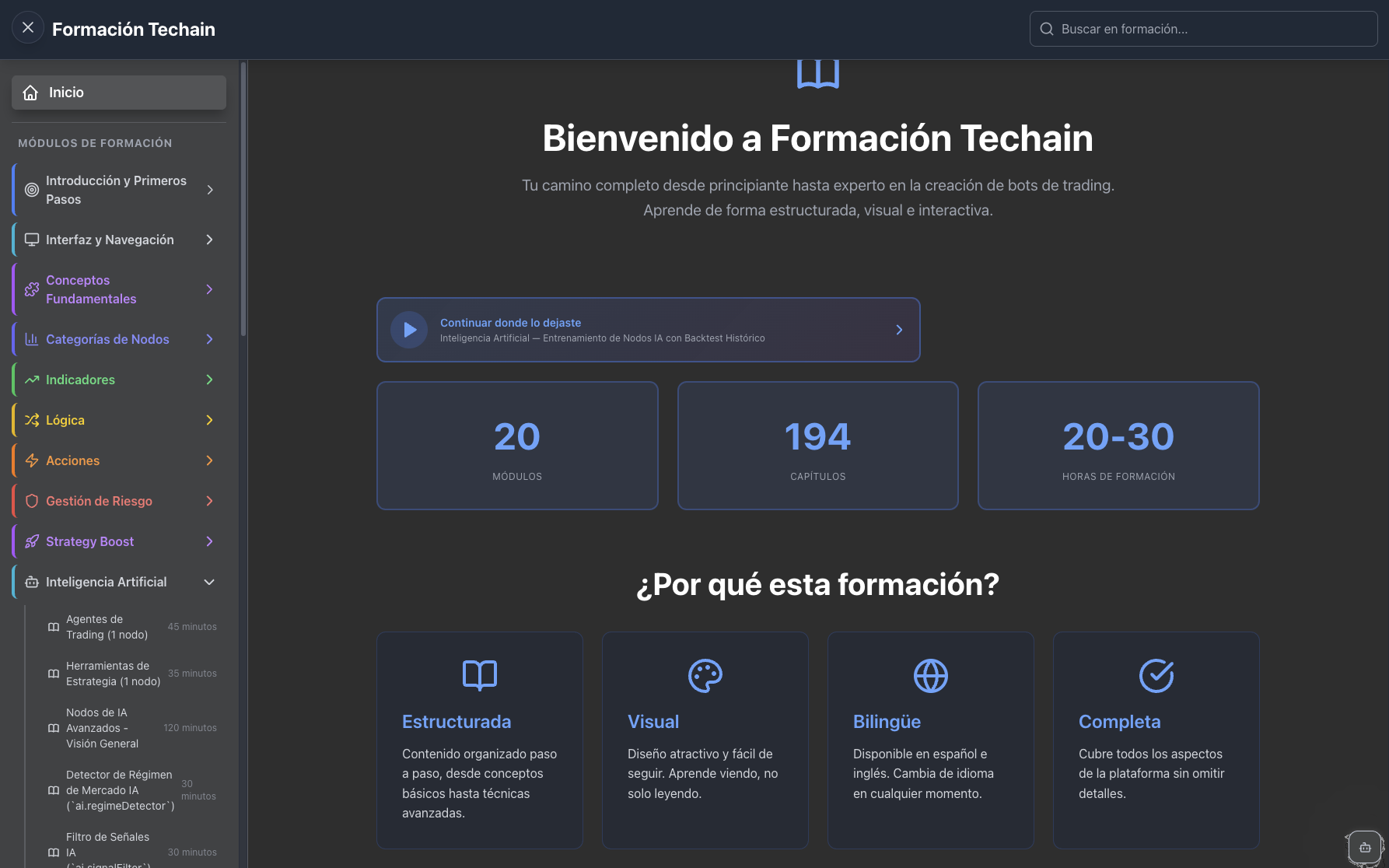 A día de hoy tenemos usuarios de todos los niveles como es obvio. Pero la gran mayoría son usuario que sabían 0 de trading algorítmicos y que no habían creado ni diseñado un bot en su vida. Este ha sido uno de los motivos por el que se han implementado multitud de ayudas dentro de la app para facilitarles el camino, como el chat AI, literalmente le describes que es lo que quieres hacer en lenguaje natural y te crea el bot en menos de 5 minutos. Por lo que cualquiera puede diseñar y construir un bot con Techain sin importar su nivel.