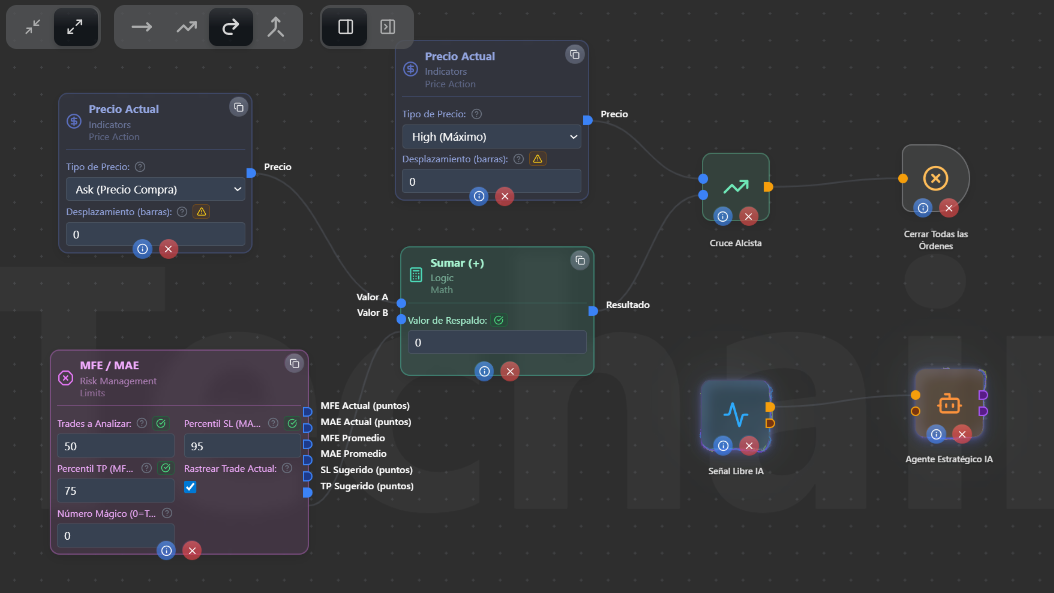 Opción 1 (Cruce Alcista: High vs Ask + TP Sugerido → Cerrar): Tiene un problema de unidades. Las salidas del nodo MFE/MAE (SL Sugerido, TP Sugerido, promedios) están en puntos (p.ej. 750 puntos), mientras que Precio Actual (Ask o High) está en precio (p.ej. 1.08500). Si los sumas directamente con el nodo Sumar, obtienes un valor sin sentido (1.08500 + 750 = 751.085). La Comparación o el Cruce nunca dispararían correctamente. Existe un nodo “Puntos → Precio” que convierte puntos a distancia de precio (750 puntos → 0.00750), pero incluso usándolo, el Ask es el precio actual del tick, no el precio de entrada de tu posición abierta, así que el “nivel objetivo” se movería constantemente. Para lo que buscas (cerrar cuando el recorrido a favor o en contra supere un umbral), la versión simplificada que tú mismo propones es la correcta (punto 3).